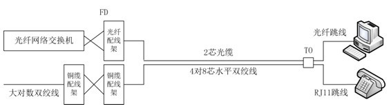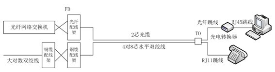 面对这样的情况,最为理想、最常采用的方式是每个使用FTTD的办公桌,同时敷设1根水平双绞线,如图2所示。这根水平双绞线主要用于传输电话信息,在万一FTTD出现问题时,它也可以传输数据,实现双介质冗余备份。