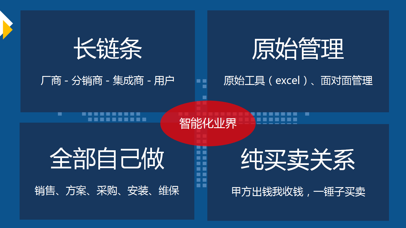 建筑智能化的长链条涵盖了厂商、分销商、集成商、用户等,厂家需要区域、省市代理,代理商需要集成商将产品卖给用户,因而,构成了建筑智能化的产业链。但目前,该领域还存在着不少问题,比如通过原始工具、面对面进行管理;或者是销售、方案、采购、安装、维保等亲力亲为,全部自己做;以及厂家和用户的纯买卖关系,甲方出钱再收钱,这是目前行业的普遍现状。