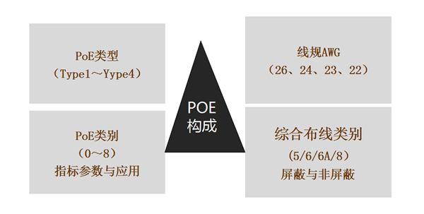 从标准方面而言,PoE本身具有几个方面的关键点:第一,PoE应用本身是分等级的,有四个类别八个等级,不同的类别和等级对PoE的性能指标、要求、参数等是不一样的。第二,强调了PoE应用时,布线和新线的限规,如新线的直径和内阻,从国际标准来说,建议选用26号线到22号线规,每种线规的使用针对不同的等级。从布线方面的五类布线到八类布线,但在REE标准中,对PoE的应用没有提到七类,只反映了五类、六类、八类,却并没有提到七类。