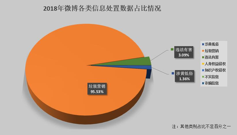 25日,新浪微博发布《2018年度微博社区治理报告》,据报告显示,2018年微博共处置各类违法违规信息共计153.88亿条,其中买卖粉丝、恶意导流卖片等垃圾营销信息147亿条,占总量的95.53%;2018年全年共处置人身攻击、冒充他人、泄漏隐私等涉及人身权益侵权的内容21.4万条。处置涉及著作权、商标权等知识产权侵权的内容56万条。