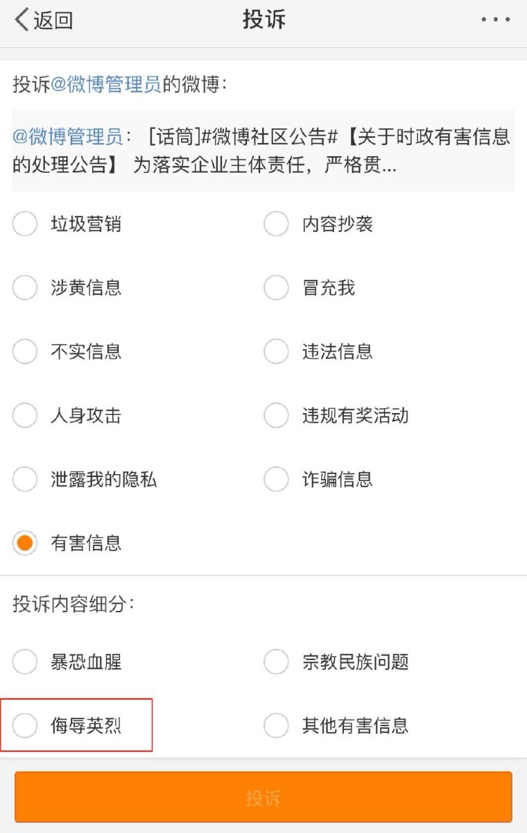 侮辱英烈举报投诉分类