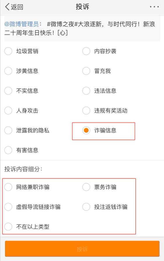 为了有效处置诈骗信息,方便广大网友投诉,微博于2018年9月上线了诈骗信息的投诉分类。主要受理高仿账号诈骗、虚假网络兼职信息诈骗、冒充票务公司官网售卖演唱会、赛事门票等6类常见的诈骗形式。同时,微博通过技术手段以及人工干预的方式,精准快速打击网络诈骗:利用技术手段改造升级相关产品,如未关注人私信提示由单独提示升级为置顶提示、聊天界面会根据内容风险等级和用户等级提示防诈骗等;官方发布公告及私信提示风险,新增诈骗信息投诉渠道,开通@微博防诈骗 官方微博及话题#微博防诈骗#以接收网友投诉。自诈骗信息投诉分类上线以来,微博通过多重手段共有效处置各类诈骗信息1.9万余条。
