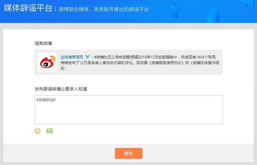 微博积极贯彻落实中央网信办关于加强互联网联合辟谣工作的指示精神,2018年11月上线了“媒体政务辟谣共治平台”,联合权威媒体和政府官微开展网络谣言大治理行动。平台对具有公信力的1638个重点媒体账号,以公安、网警为主的1322个政务账号开通辟谣功能权限。通过辟谣平台发布辟谣信息,谣言能够快速被识别,对于广大网友识别网络谣言,了解事实真相具有重要意义。