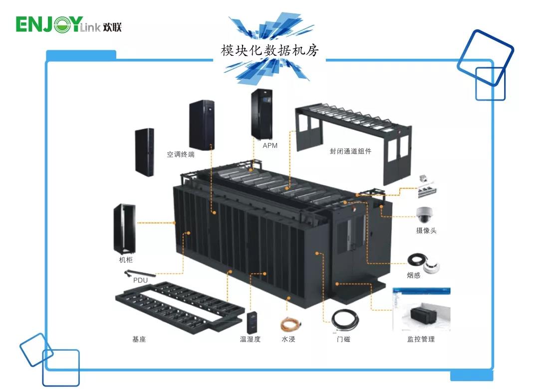 模块化数据机房则是为了应对云计算、云边缘计算、虚拟化、集中化、高密化等服务器的变化,为了提高数据中心的运营效率,降低能耗,实现快速扩容且互不影响而推出的快速预装式模块化数据中心。