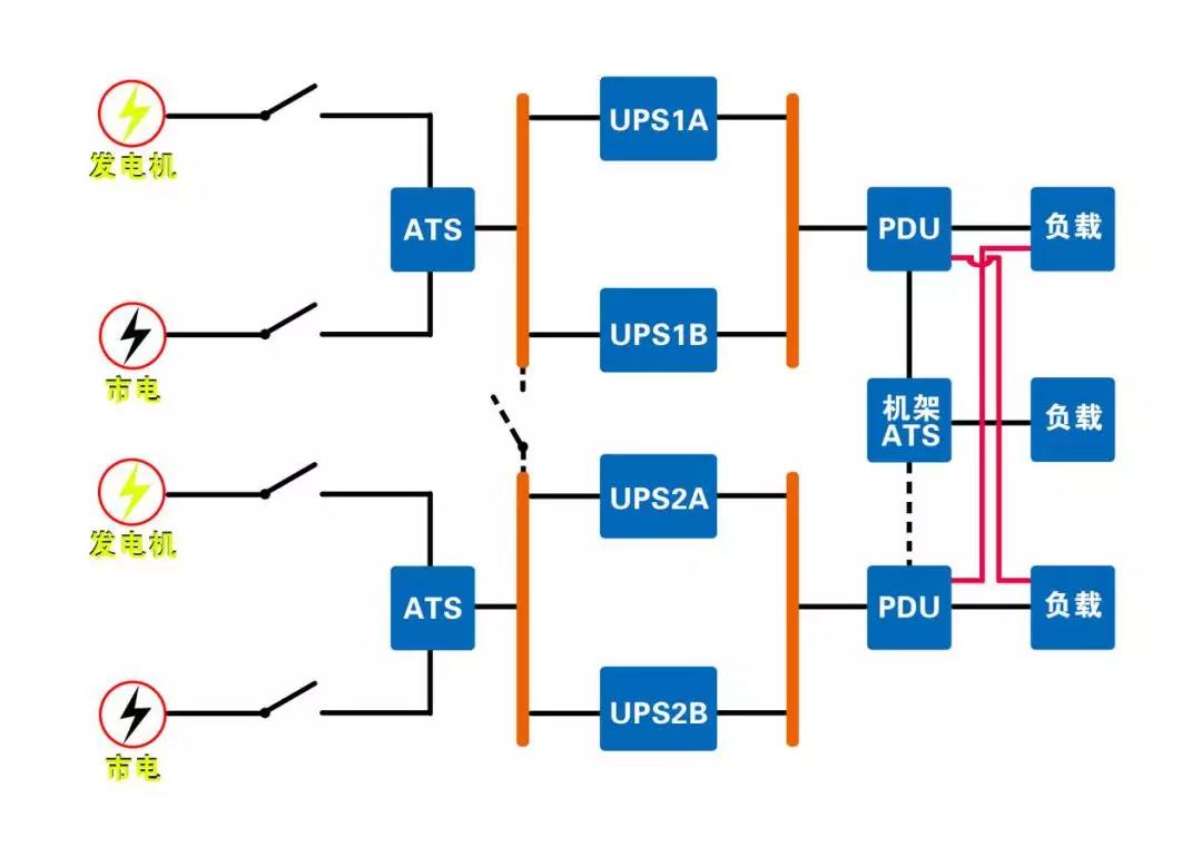 2、该配置为从电力入口到关键负载的所有线路提供了完方位的冗余;