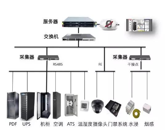 1、电源系统监控:系统通过PDF列头配电柜(PDF)将所有配电模块集中放置在列头柜、ATS(自动转换开关)是市电与油机电切换、双路由电源切换必不可少的设备、UPS不间断电源(UPS)当停电时能够紧急取代市电,供应电力给设备及蓄电池上的智能仪表标配的RS485(或FE)接口,对机房供电系统各类电参数信息进行采集、分析,并通过人机交互界面进行实时显示。电源系统监控架构如图所示。